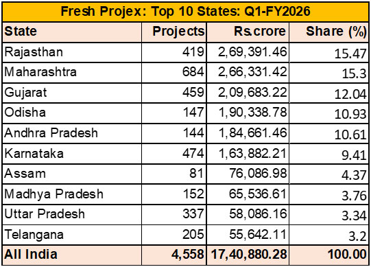 Odisha ranked 4th up from 6th in the preceding quarter, benefited by a couple of steel projects and a super-mega Aluminium smelter project. In all, the state attracted 147 new projects worth Rs 1,90,338.78 crore in the first quarter of FY2026.